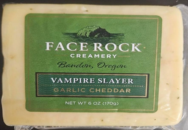 On November 14, 2025, Face Rock Creamery LLC of Bandon, OR, recalled 16 6 oz. Units of Vampire Slayer Garlic Cheddar with a use-by date of 11/04/26 because it has the potential to be contaminated with Listeria monocytogenes. The company initiated the recall due to the FDA environmental sample identified the presence of Listeria monocytogenes in the processing area where this cheese was packaged. The finished product has not tested positive for any contaminants. The affected Vampire Slayer Cheddar Block with a use-by date of 11/04/26 was sold exclusively at the Face Rock Flagship store located at 680 2nd St. SE, Bandon, Oregon. Approximately 16 units were sold between November 10 at 3:30 pm PT and November 13, 2025, at 3:30 pm PT. @ https://www.fda.gov/safety/recalls-market-withdrawals-safety-alerts/face-rock-creamery-llc-recalls-6oz-vampire-slayer-garlic-cheddar-because-possible-health-risk