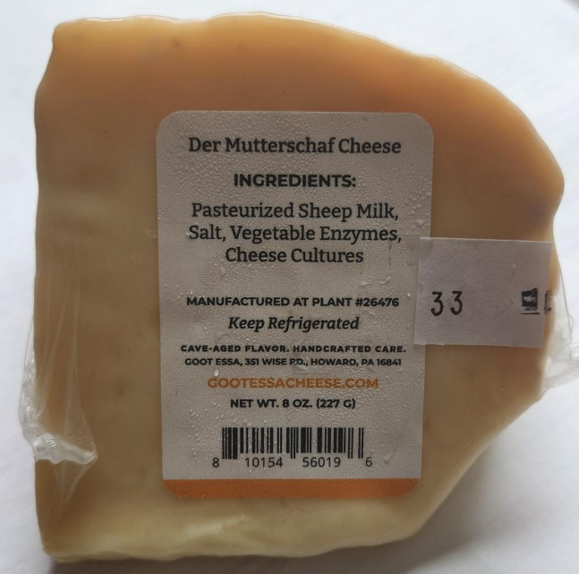 The FDA reported that Goot Essa LLC(Howard, PA) recalled one lot totaling 64 pounds, batch 33, of its Goot Essa brand Der Mutterschaf Cheese because it has the potential to be contaminated with Listeria monocytogenes. The Goot Essa brand of Der Mutterschaf Cheese was distributed to 7 customers in New Jersey, Virginia, Connecticut, and Montana, and it was made available through retail stores and restaurants. The product comes in 4 oz and 8 oz clear plastic packages, with 4 oz marked as UPC 810154560189 and 8 oz marked as UPC 810154560196, both featuring a lot number 33 sticker on the back. No illnesses have been reported to date in connection with this problem. The potential for contamination was noted after routine testing by the company revealed the presence of Listeria monocytogenes in one sample from the batch. Sampling of similar batches revealed no contamination. Goot Essa will work closely with the FDA to conclude the investigation. @ https://www.fda.gov/safety/recalls-market-withdrawals-safety-alerts/goot-essa-recalls-der-mutterschaf-cheese-because-possible-health-risk