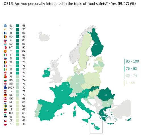EFSA conducts the survey every three years. This year, it includes the 27 EU member states and seven EU candidate countries. The Eurobarometer fieldwork was conducted in March and April of 2025, involving more than 26,300 interviews in EU countries and 5,600 interviews in Albania, Bosnia and Herzegovina, Kosovo, Montenegro, North Macedonia, Serbia, and Turkey between March and May. The majority of EU citizens are interested in food safety, and it is among the most important factors affecting food-purchasing decisions 72% are ‘personally interested’ in the topic of food safety. Interest is especially high in Greece (98%), Cyprus (95%), and Finland (88%). Cost (60%) is the most frequently selected factor by EU citizens as the most important when buying food. Taste (51%) comes second, followed by food safety (46%). The proportion of individuals mentioning cost as one of the main factors when buying food has increased by 6% since 2022. Awareness of food safety topics remains high among EU citizens. 28% have a very high level of awareness of food safety (+ 7% from 202). 78% of EU citizens indicate they are likely to change their food preparation or consumption behavior if a food poisoning incident is reported and authorities advise taking precautionary measures. The results of the Eurobarometer survey on ‘Food safety in the EU’ clearly show that EU citizens are interested in food safety, that they are generally aware of food safety topics, and that they take into account food safety concerns in their behavior as consumers.@ https://www.efsa.europa.eu/sites/default/files/2025-09/2025%20EB%20103.3%20EFSA%20Report_vfinal.pdf